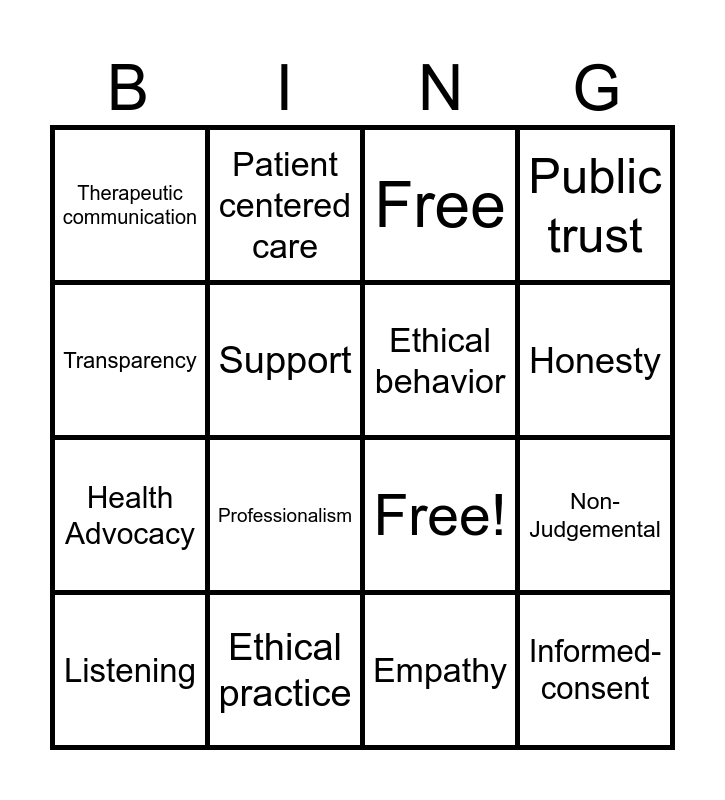 This bingo card has 20 words: Free!, Autonomy, Patient centered care, Empathy, Informed- consent, Health Advocacy, Ethical practice, Free, Non-Judgemental, Therapeutic communication, Professionalism, Ethical behavior, Public trust, Listening, Support, Best practice, Honesty, Transparency, Choice and Therapeutic relationship.