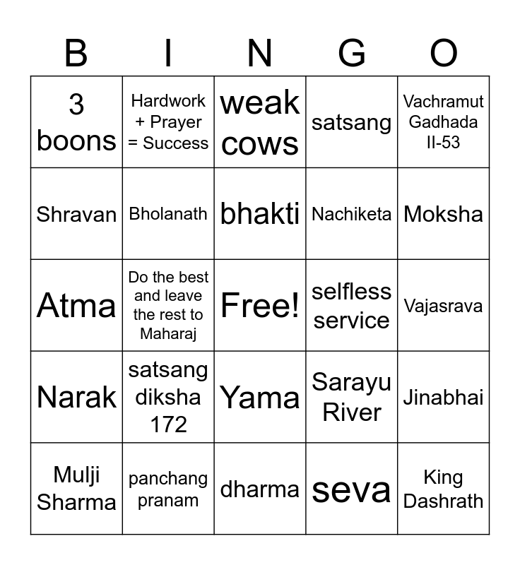 This bingo card has a free space and 25 words: satsang diksha 172, dharma, bhakti, Mulji Sharma, Vachramut Gadhada II-53, 3 boons, Shravan, Hardwork + Prayer = Success, selfless service, Yama, Nachiketa, Atma, Sarayu River, Jinabhai, Bholanath, Gossiping, Vajasrava, weak cows, Moksha, Do the best and leave the rest to Maharaj, King Dashrath, panchang pranam, Narak, satsang and seva.