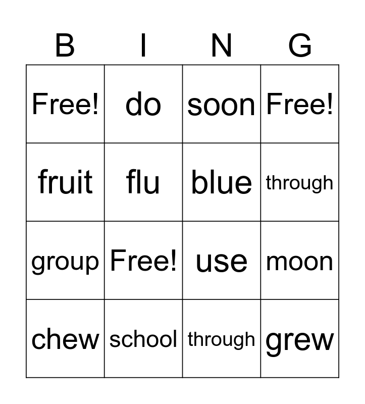 This bingo card has 16 words: chew, school, soon, Free!, fruit, do, use, moon, Free!, flu, through, through, group, Free!, blue and grew.