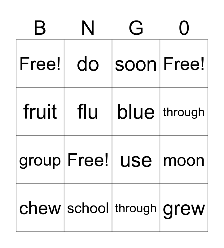 This bingo card has 16 words: chew, school, soon, Free!, fruit, do, use, moon, Free!, flu, through, through, group, Free!, blue and grew.
