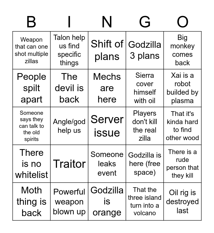 This bingo card has 25 words: Traitor, Godzilla is orange, Mechs are here, Moth thing is back, Big monkey comes back, Weapon that can one shot multiple zillas, People spilt apart, Talon help us find specific things, Players don't kill the real zilla, Someone leaks event, Sierra cover himself with oil, Someone says they can talk to the old spirits, Godzilla is here (free space), There is a rude person that they kill, The devil is back, Oil rig is destroyed last, That it's kinda hard to find other wood, Shift of plans, Xai is a robot builded by plasma, Angle/god help us, Server issue, Powerful weapon blown up, There is no whitelist, Godzilla 3 plans and That the three island turn into a volcano.
