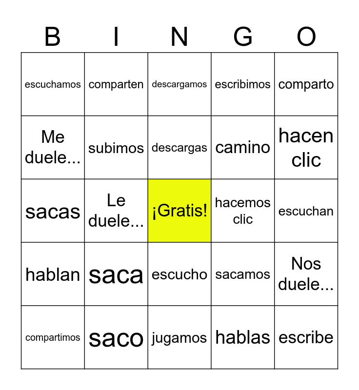 This bingo card has a free space and 34 words: hablo, hablas, habla, hablamos, hablan, subimos, comparto, compartimos, comparten, descargo, descargas, descargamos, descargan, hago clic, hacemos clic, hacen clic, saco, sacas, saca, sacamos, escucho, escuchas, escuchamos, escuchan, jugamos, escribe, escribimos, escribe, camino, Me duele..., Te duele..., Le duele..., Nos duele... and Les duele....