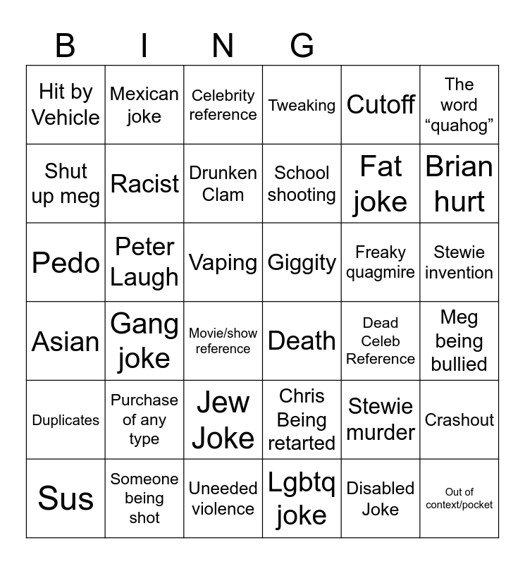 This bingo card has 36 words: Chris Being retarted, Jew Joke, Lgbtq joke, Shut up meg, Asian, Giggity, Racist, Uneeded violence, Cutoff, Stewie murder, Brian hurt, Tweaking, Crashout, Peter Laugh, School shooting, Hit by Vehicle, Duplicates, Freaky quagmire, Pedo, Celebrity reference, Vaping, Gang joke, Death, Movie/show reference, Dead Celeb Reference, Mexican joke, Fat joke, Someone being shot, Drunken Clam, The word “quahog”, Out of context/pocket, Sus, Meg being bullied, Stewie invention, Purchase of any type and Disabled Joke.