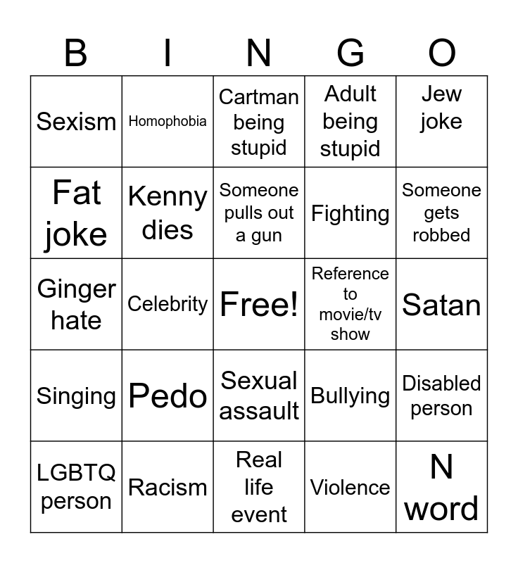 This bingo card has a free space and 24 words: Pedo, Racism, Someone pulls out a gun, LGBTQ person, Jew joke, Sexism, Fat joke, Homophobia, Reference to movie/tv show, Sexual assault, Fighting, Ginger hate, Bullying, Disabled person, Kenny dies, Violence, Satan, Cartman being stupid, Someone gets robbed, Celebrity, N word, Singing, Adult being stupid and Real life event.