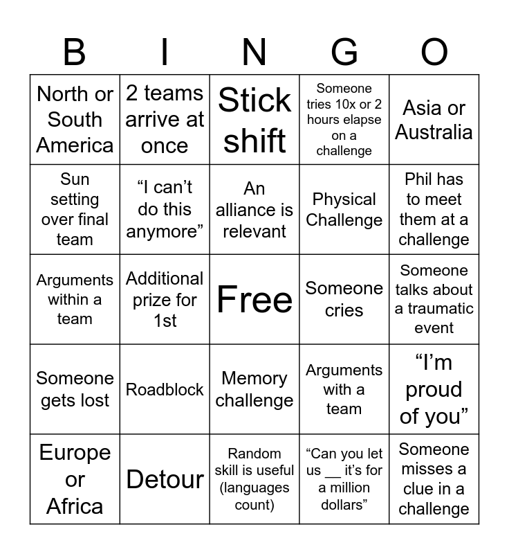 This bingo card has a free space and 24 words: Roadblock, Detour, An alliance is relevant, Europe or Africa, Asia or Australia, North or South America, Sun setting over final team, 2 teams arrive at once, Someone cries, Memory challenge, Physical Challenge, Arguments within a team, Arguments with a team, “I’m proud of you”, “I can’t do this anymore”, “Can you let us __ it’s for a million dollars”, Someone talks about a traumatic event, Stick shift, Phil has to meet them at a challenge, Additional prize for 1st, Someone misses a clue in a challenge, Someone gets lost, Someone tries 10x or 2 hours elapse on a challenge and Random skill is useful (languages count).