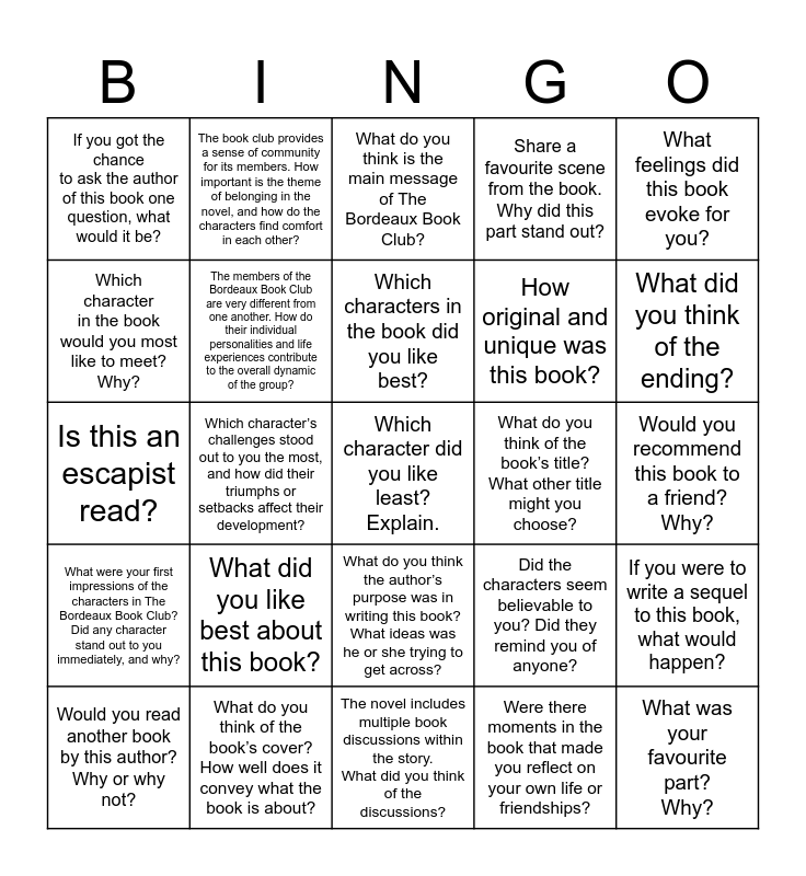 This bingo card has 25 words: What did you like best about this book?, The novel includes multiple book discussions within the story. What did you think of the discussions?, Which characters in the book did you like best?, Would you read another book by this author? Why or why not?, What feelings did this book evoke for you?, If you got the chance to ask the author of this book one question, what would it be?, Which character in the book would you most like to meet? Why?, The book club provides a sense of community for its members. How important is the theme of belonging in the novel, and how do the characters find comfort in each other?, What do you think of the book’s title? What other title might you choose?, What do you think the author’s purpose was in writing this book? What ideas was he or she trying to get across?, How original and unique was this book?, Is this an escapist read?, Did the characters seem believable to you? Did they remind you of anyone?, If you were to write a sequel to this book, what would happen?, The members of the Bordeaux Book Club are very different from one another. How do their individual personalities and life experiences contribute to the overall dynamic of the group?, What was your favourite part? Why?, Would you recommend this book to a friend? Why?, What do you think is the main message of The Bordeaux Book Club?, What did you think of the ending?, Which character’s challenges stood out to you the most, and how did their triumphs or setbacks affect their development?, Which character did you like least? Explain., What do you think of the book’s cover? How well does it convey what the book is about?, What were your first impressions of the characters in The Bordeaux Book Club? Did any character stand out to you immediately, and why?, Share a favourite scene from the book. Why did this part stand out? and Were there moments in the book that made you reflect on your own life or friendships?.