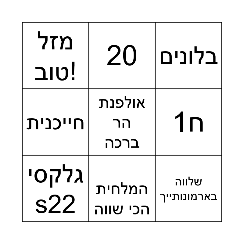 This bingo card has a free space and 21 words: יש להן בני דודים משותפים, אלון מורה, 20, אמוןן, תלתלים, גלקסי s22, מזל טוב!, בלונים, יומולדת, המלחית הכי שווה, הפתעה, חייכנית, שמחה, בכורה, ח1, לפינה חמה, 1,3,5, חום, שלווה בארמונותייך, קוטאי and שער.