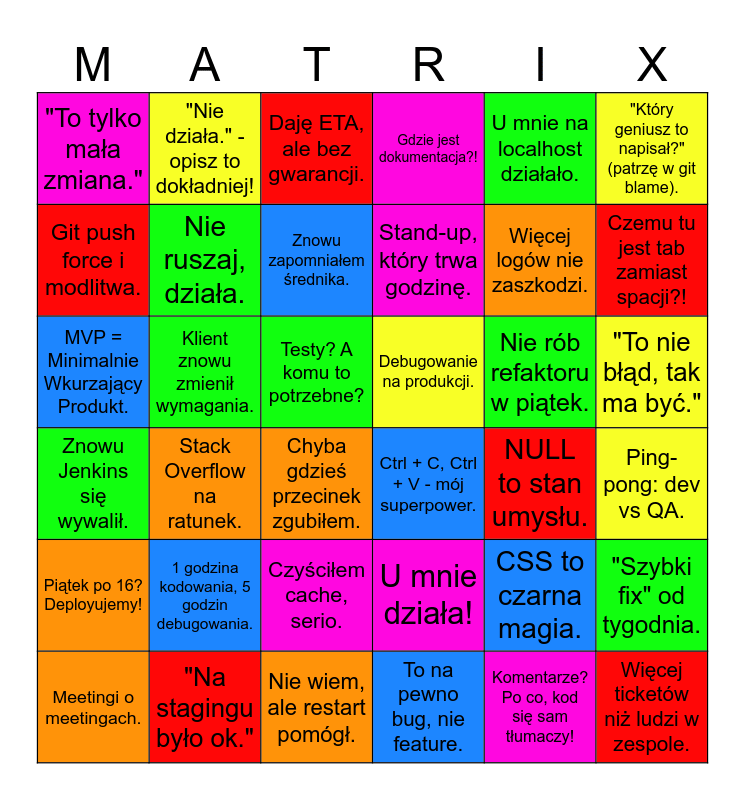This bingo card has 36 words: U mnie działa!, Czyściłem cache, serio., To na pewno bug, nie feature., Git push force i modlitwa., Znowu Jenkins się wywalił., Debugowanie na produkcji., Nie ruszaj, działa., Nie wiem, ale restart pomógł., U mnie na localhost działało., CSS to czarna magia., Czemu tu jest tab zamiast spacji?!, Gdzie jest dokumentacja?!, "Szybki fix" od tygodnia., Klient znowu zmienił wymagania., Stand-up, który trwa godzinę., "To tylko mała zmiana.", Piątek po 16? Deployujemy!, Nie rób refaktoru w piątek., MVP = Minimalnie Wkurzający Produkt., Daję ETA, ale bez gwarancji., Testy? A komu to potrzebne?, Stack Overflow na ratunek., Ctrl + C, Ctrl + V - mój superpower., Chyba gdzieś przecinek zgubiłem., NULL to stan umysłu., "Nie działa." - opisz to dokładniej!, Więcej logów nie zaszkodzi., "Na stagingu było ok.", Znowu zapomniałem średnika., "Który geniusz to napisał?" (patrzę w git blame)., Więcej ticketów niż ludzi w zespole., Meetingi o meetingach., Ping-pong: dev vs QA., "To nie błąd, tak ma być.", 1 godzina kodowania, 5 godzin debugowania. and Komentarze? Po co, kod się sam tłumaczy!.
