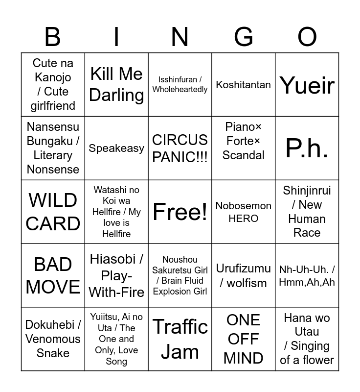 This bingo card has a free space and 24 words: Dokuhebi / Venomous Snake, Hiasobi / Play-With-Fire, CIRCUS PANIC!!!, ONE OFF MIND, Yueir, Cute na Kanojo / Cute girlfriend, Kill Me Darling, Isshinfuran / Wholeheartedly, Nobosemon HERO, Shinjinrui / New Human Race, WILD CARD, Speakeasy, Urufizumu / wolfism, Nh-Uh-Uh. / Hmm,Ah,Ah, Nansensu Bungaku / Literary Nonsense, Yuiitsu, Ai no Uta / The One and Only, Love Song, Traffic Jam, Koshitantan, P.h., BAD MOVE, Watashi no Koi wa Hellfire / My love is Hellfire, Noushou Sakuretsu Girl / Brain Fluid Explosion Girl, Piano× Forte× Scandal and Hana wo Utau / Singing of a flower.