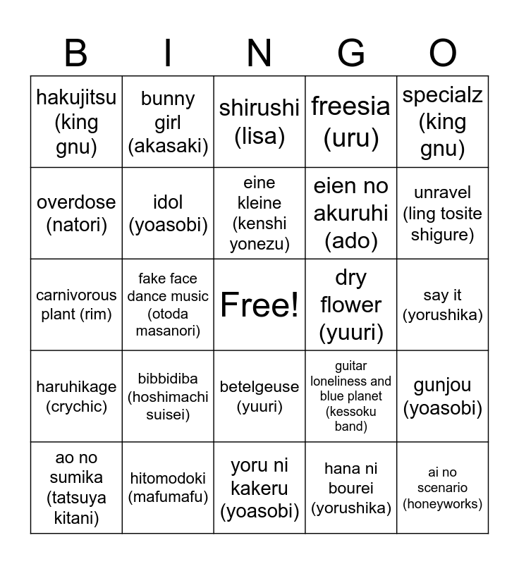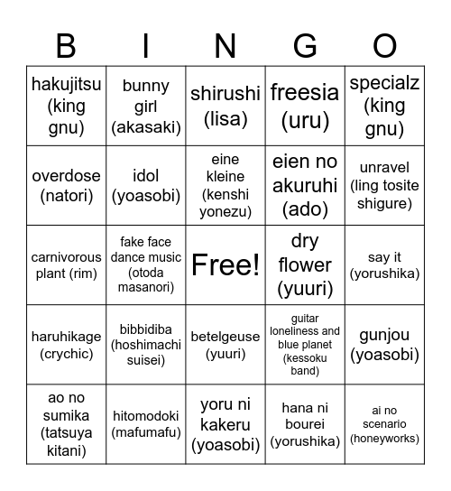 This bingo card has a free space and 24 words: bibbidiba (hoshimachi suisei), hitomodoki (mafumafu), eine kleine (kenshi yonezu), ao no sumika (tatsuya kitani), specialz (king gnu), hakujitsu (king gnu), overdose (natori), bunny girl (akasaki), dry flower (yuuri), betelgeuse (yuuri), eien no akuruhi (ado), carnivorous plant (rim), guitar loneliness and blue planet (kessoku band), gunjou (yoasobi), idol (yoasobi), hana ni bourei (yorushika), say it (yorushika), shirushi (lisa), unravel (ling tosite shigure), fake face dance music (otoda masanori), ai no scenario (honeyworks), haruhikage (crychic), freesia (uru) and yoru ni kakeru (yoasobi).