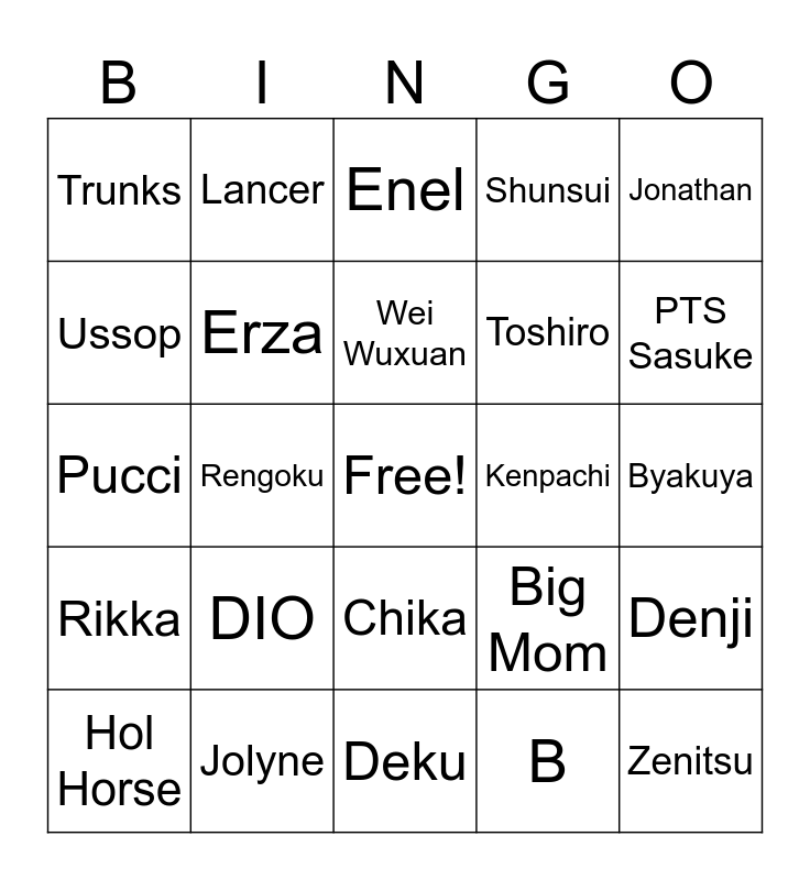 This bingo card has a free space and 161 words: PTS Luffy, PTS Zoro, PTS Sanji, Law, Ace, TS Luffy, TS Zoro, TS Sanji, Kizaru, Akainu, Ussop, Crocodile, Enel, Jinbe, Big Mom, Lucci, Aokiji, Arlong, Whitebeard, Shanks, Goku (Namek), Vegeta (Android), Piccolo, Krillin, Gohan, Buu Goku, Trunks, Caulifla, Majin Vegeta, Vegito, Frieza, Cell, Pui Pui, DBS Goku, DBS Vegeta, Gogeta, Bardock, Broly, Goku Black, PTS Naruto, PTS Sasuke, Kakashi, Rock Lee, Neji, Zabuza, Gaara, TS Sasuke, TS Naruto, Itachi, Pain, Might Guy, Ay, Kisame, B, War Arc Sasuke, Minato, Madara, Ichigo, Rukia, Shinji, Byakuya, Shunsui, Gin, Grimmjow, Starrk, Toshiro, Ulquiorra, Hollow Ichigo, Yoruichi, Kenpachi, Aizen, Kisuke, Yamamoto, Rikka, Kazuma, Afro, Chika, Saitama, Ryuko, Guts, Asta, Hiei, Yusuke, Accelerator, Misaka, Ogun, Tatsumaki, Mob, Akira, Ragna, Maka and Soul, Alucard, Wei Wuxuan, Sung Jinwoo, Jonathan, Young Joseph, Jotaro, Old Joseph, Josuke, Giorno, Kira Yoshikage, Jolyne, Hol Horse, Pucci, DIO, Diavolo, Gon, Killua, Hisoka, Illumi, Chrollo, Yuji, Gojo, Todo, Sukuna, Choso, Kenjaku, Nanami, Deku, Bakugo, All Might, Todoroki, Iida, Mirio, Tokoyami, Vigilante Deku, Shirou, Saber, Gilgamesh, Kiritsugu, Lancer, Ishkander, Ishtar, Mash, Ilya, Natsu, Gray, Erza, Denji, Aki, Power, Tanjiro, Rengoku, Uzui, Kokushibou, Ohma, Zenitsu, Shisui, Tobi, Satsuki, Achilles, Zamasu, Deidara, Super Dummy, Hercule, Shadow Dio, Kirito, Asuna, Sinon, Myst and Mayson Baek.