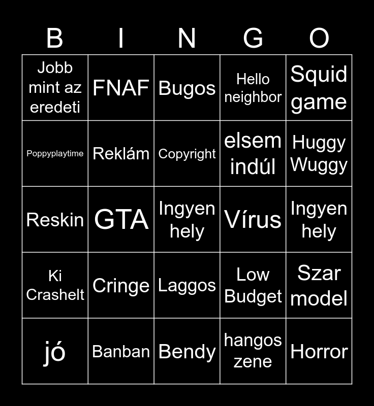 This bingo card has a free space and 24 words: Cringe, Banban, Copyright, jó, Squid game, Jobb mint az eredeti, Poppyplaytime, FNAF, Vírus, Laggos, elsem indúl, Reskin, Low Budget, Szar model, Reklám, hangos zene, Ingyen hely, Bugos, Huggy Wuggy, GTA, Horror, Ki Crashelt, Hello neighbor and Bendy.