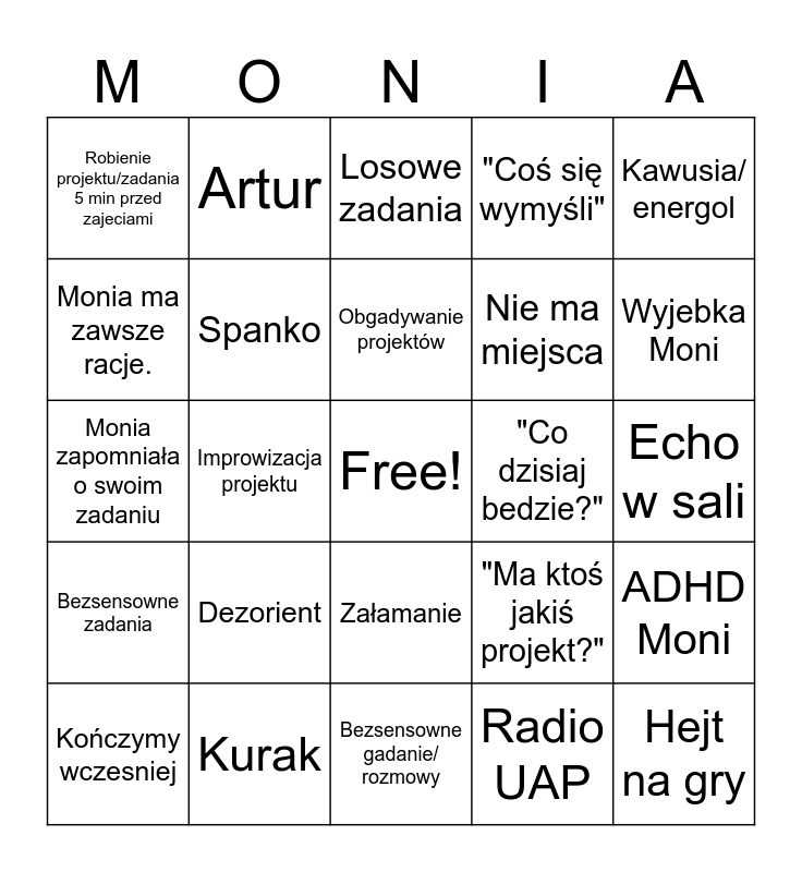 This bingo card has a free space and 24 words: Dezorient, Kurak, Obgadywanie projektów, Kończymy wczesniej, Kawusia/ energol, Robienie projektu/zadania 5 min przed zajeciami, Monia ma zawsze racje., Artur, "Co dzisiaj bedzie?", Załamanie, Nie ma miejsca, Monia zapomniała o swoim zadaniu, "Ma ktoś jakiś projekt?", ADHD Moni, Spanko, Radio UAP, Echo w sali, Losowe zadania, Wyjebka Moni, Improwizacja projektu, Hejt na gry, Bezsensowne zadania, "Coś się wymyśli" and Bezsensowne gadanie/ rozmowy.