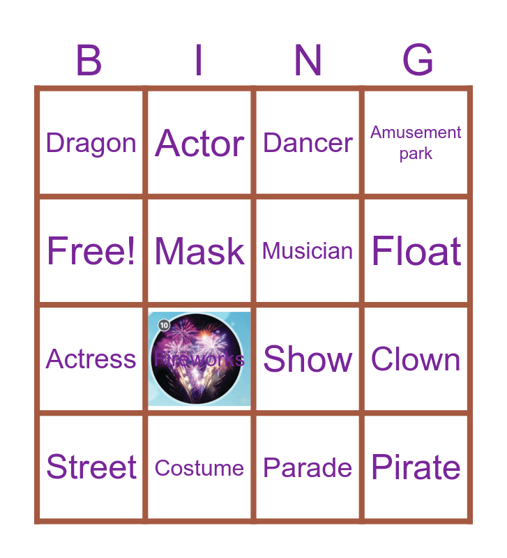 This bingo card has 1 images and 16 words: Costume, Clown, Dancer, Dragon, Actress, Actor, Show, Parade, Free!, Mask, Street, Amusement park, Fireworks, Float, Musician and Pirate.