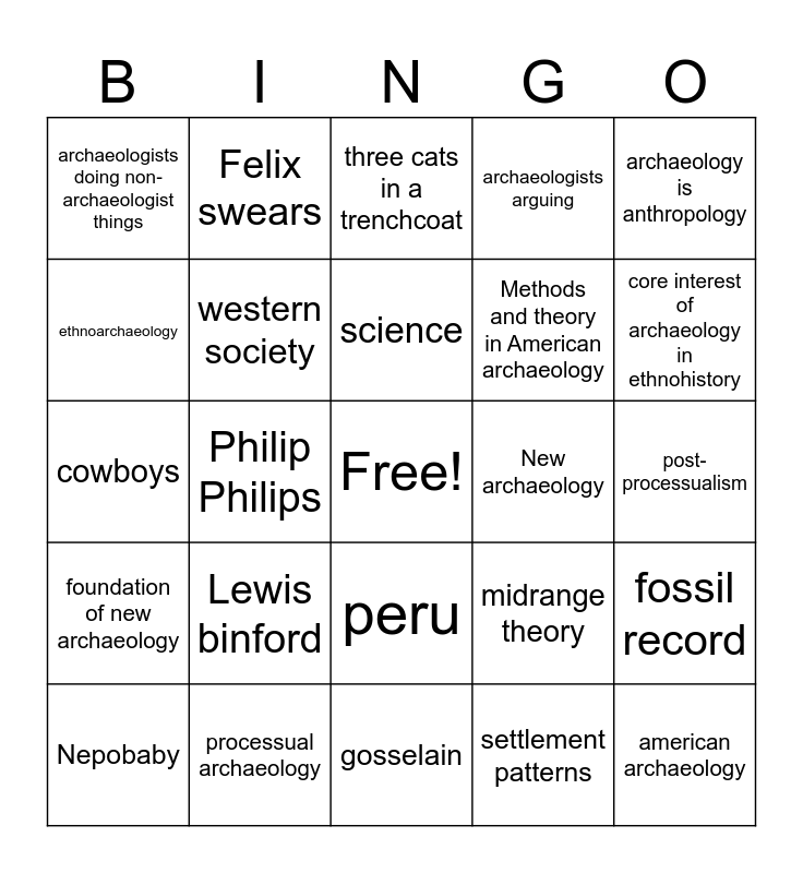 This bingo card has a free space and 24 words: Lewis binford, processual archaeology, science, Nepobaby, archaeology is anthropology, archaeologists doing non-archaeologist things, ethnoarchaeology, Felix swears, New archaeology, peru, Methods and theory in American archaeology, cowboys, midrange theory, fossil record, western society, settlement patterns, post-processualism, three cats in a trenchcoat, core interest of archaeology in ethnohistory, Philip Philips, american archaeology, foundation of new archaeology, archaeologists arguing and gosselain.
