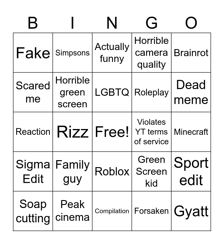 This bingo card has a free space and 24 words: Family guy, Peak cinema, LGBTQ, Soap cutting, Brainrot, Fake, Scared me, Simpsons, Violates YT terms of service, Roblox, Roleplay, Reaction, Green Screen kid, Sport edit, Horrible green screen, Forsaken, Minecraft, Actually funny, Dead meme, Rizz, Gyatt, Sigma Edit, Horrible camera quality and Compilation.