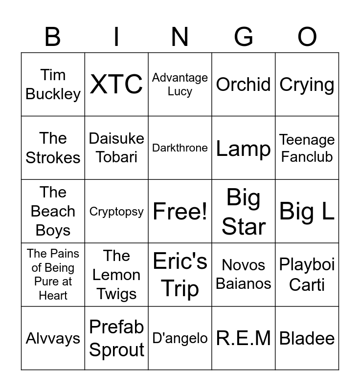 This bingo card has a free space and 24 words: The Lemon Twigs, Prefab Sprout, Darkthrone, Alvvays, Crying, Tim Buckley, The Strokes, XTC, Big Star, Eric's Trip, Lamp, The Beach Boys, Novos Baianos, Playboi Carti, Daisuke Tobari, R.E.M, Big L, Advantage Lucy, Teenage Fanclub, Cryptopsy, Bladee, The Pains of Being Pure at Heart, Orchid and D'angelo.