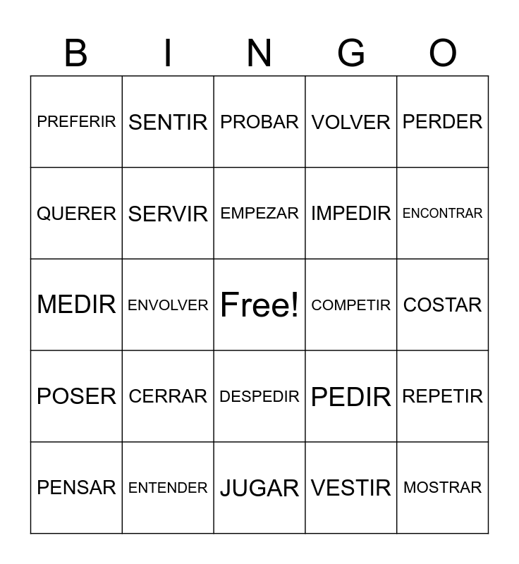 This bingo card has a free space and 24 words: CERRAR, ENTENDER, EMPEZAR, PENSAR, PERDER, PREFERIR, QUERER, SENTIR, COMPETIR, DESPEDIR, IMPEDIR, MEDIR, PEDIR, REPETIR, SERVIR, VESTIR, COSTAR, PROBAR, ENCONTRAR, ENVOLVER, MOSTRAR, POSER, VOLVER and JUGAR.