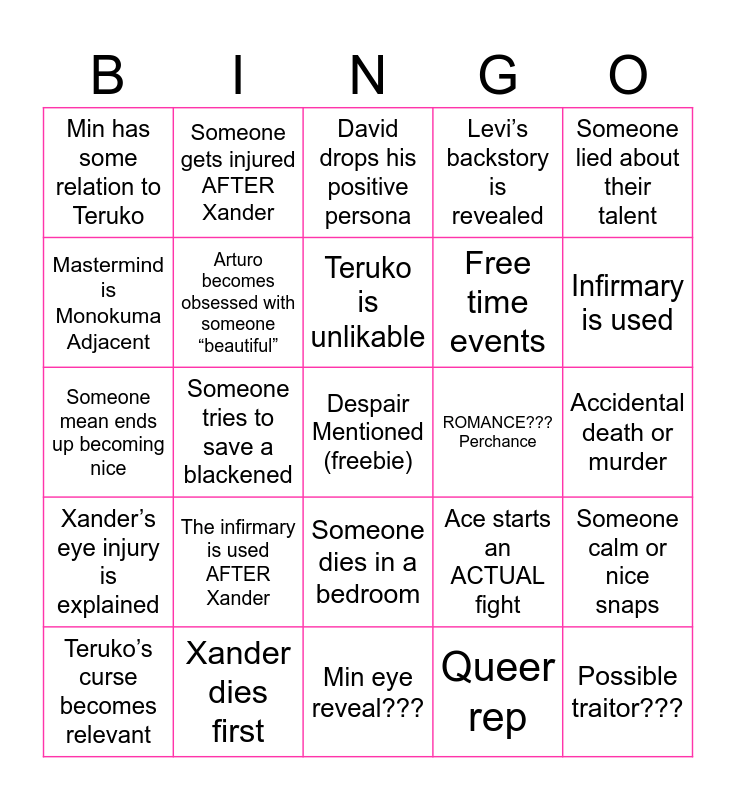 This bingo card has a free space and 24 words: The infirmary is used AFTER Xander, Xander dies first, Teruko is unlikable, Teruko’s curse becomes relevant, Someone lied about their talent, Min has some relation to Teruko, Mastermind is Monokuma Adjacent, Someone gets injured AFTER Xander, ROMANCE??? Perchance, Someone dies in a bedroom, Free time events, Someone mean ends up becoming nice, Ace starts an ACTUAL fight, Someone calm or nice snaps, Arturo becomes obsessed with someone “beautiful”, Queer rep, Accidental death or murder, David drops his positive persona, Infirmary is used, Someone tries to save a blackened, Possible traitor???, Xander’s eye injury is explained, Levi’s backstory is revealed and Min eye reveal???.