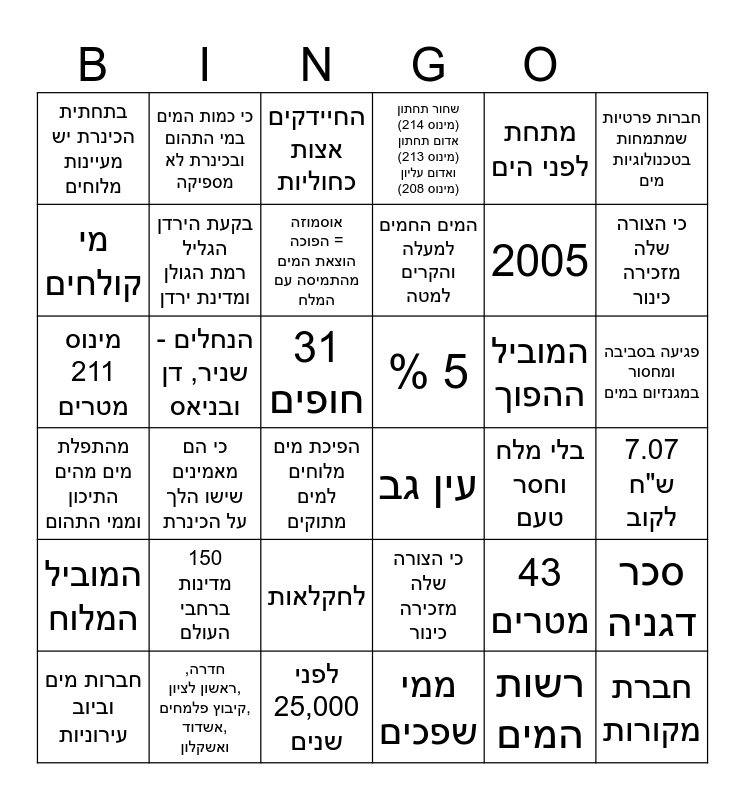 This bingo card has 36 words: כי הצורה שלה מזכירה כינור, לחקלאות, ממי שפכים, מי קולחים, מהתפלת מים מהים התיכון וממי התהום, % 5, בקעת הירדן הגליל רמת הגולן ומדינת ירדן, לפני 25,000 שנים, מתחת לפני הים, 43 מטרים, כי הצורה שלה מזכירה כינור, שחור תחתון (מינוס 214) אדום תחתון (מינוס 213) ואדום עליון (מינוס 208), סכר דגניה, - הנחלים שניר, דן ובניאס, המים החמים למעלה והקרים למטה, בתחתית הכינרת יש מעיינות מלוחים, המוביל המלוח, המוביל ההפוך, מינוס 211 מטרים, החיידקים אצות כחוליות, 31 חופים, כי הם מאמינים שישו הלך על הכינרת, עין גב, הפיכת מים מלוחים למים מתוקים, בלי מלח וחסר טעם, כי כמות המים במי התהום ובכינרת לא מספיקה, 2005, ,חדרה ראשון לציון, קיבוץ פלמחים, אשדוד, ואשקלון, אוסמוזה הפוכה = הוצאת המים מהתמיסה עם המלח, חברות פרטיות שמתמחות בטכנולוגיות מים, חברת מקורות, חברות מים וביוב עירוניות, 7.07 ש"ח לקוב, פגיעה בסביבה ומחסור במגנזיום במים, 150 מדינות ברחבי העולם and רשות המים.
