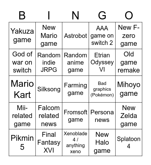This bingo card has a free space and 24 words: Falcom related news, Final Fantasy XVI, Random anime game, Pikmin 5, New F-zero game, Yakuza game, God of war on switch, New Mario game, Bad graphics (Pokémon), Fromsoft game, Etrian Odyssey VI, Mario Kart, Persona news, New Zelda game, Random indie JRPG, New Halo game, Mihoyo game, Astrobot, Old game remake, Silksong, Splatoon 4, Mii-related game, AAA game on switch 2 and Xenoblade 4 / anything xeno.