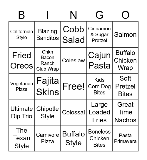 This bingo card has a free space and 29 words: The Texan Style, BBQ Pizza, Fajita Skins, BBQ Cowboy Wrap, Californian Style, Cobb Salad, Chkn Bacon Ranch Club Wrap, Chipotle Style, Kids Corn Dog Bites, Carnivore Pizza, Soft Pretzel Bites, Pasta Primavera, Buffalo Style, Boneless Chicken Bites, Buffalo Chicken Wrap, Chicken Alfredo, Colossal, Ultimate Dip Trio, Salmon, Vegetarian Pizza, Large Loaded Fries, Cowboy Skins, Cajun Pasta, Fried Oreos, Cinnamon & Sugar Pretzel, Blazing Banditos, Great Time Nachos, Coleslaw and Fried Bread Pudding.