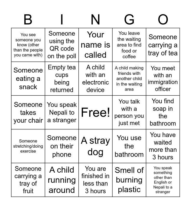 This bingo card has a free space and 24 words: Someone on their phone, A child running around, A child with an electronic device, Someone carrying a tray of fruit, Someone carrying a tray of tea, You see someone you know (other than the people you came with), Someone eating a snack, Someone using the QR code on the poll, You talk with a person you just met, A stray dog, A child making friends with another child in the waiting area, Someone takes your chair, You use the bathroom, You have waited more than 3 hours, Empty tea cups being returned, Smell of burning plastic, You find soap in the bathroom, Your name is called, You meet with an immigration officer, You speak Nepali to a stranger, You speak something other than English or Nepali to a stranger, Someone stretching/doing exercise, You leave the waiting area to find food or coffee and You are finished in less than 3 hours.