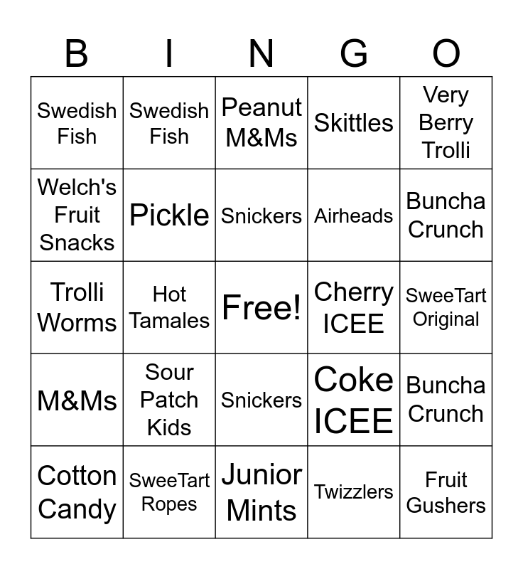 This bingo card has a free space and 29 words: Cotton Candy, Blue ICEE, Hot Tamales, Raisinets, Swedish Fish, Peanut M&Ms, Pickle, Sour Patch Kids, Cherry ICEE, SweeTart Ropes, SweeTart Original, Fruit Gushers, Junior Mints, Twizzlers, Buncha Crunch, Chocolate Almonds, Snickers, M&Ms, Very Berry Trolli, Trolli Worms, Coke ICEE, Milk Duds, Airheads, Welch's Fruit Snacks, Skittles, Swedish Fish, Buncha Crunch, Snickers and Hot Tamales.