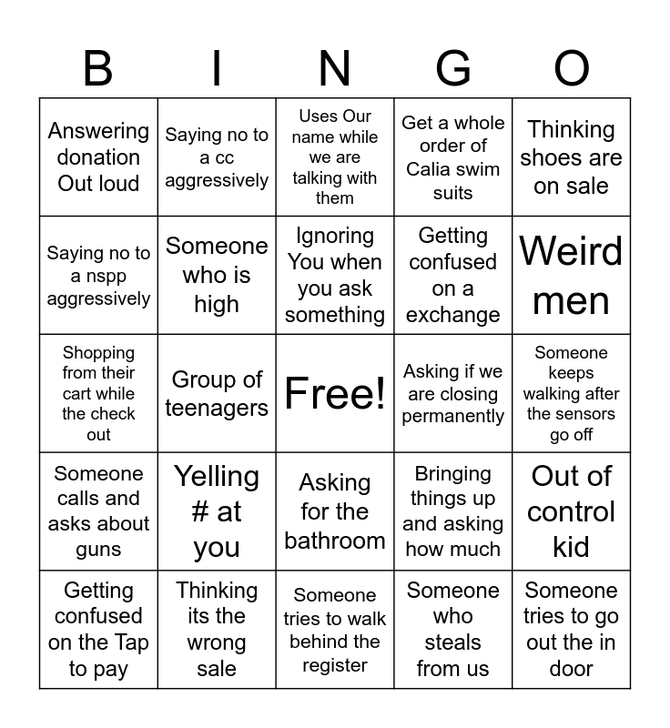 This bingo card has a free space and 24 words: Yelling # at you, Thinking its the wrong sale, Ignoring You when you ask something, Getting confused on the Tap to pay, Thinking shoes are on sale, Answering donation Out loud, Saying no to a nspp aggressively, Saying no to a cc aggressively, Asking if we are closing permanently, Asking for the bathroom, Getting confused on a exchange, Shopping from their cart while the check out, Bringing things up and asking how much, Out of control kid, Someone who is high, Someone who steals from us, Someone keeps walking after the sensors go off, Uses Our name while we are talking with them, Weird men, Group of teenagers, Someone tries to go out the in door, Someone calls and asks about guns, Get a whole order of Calia swim suits and Someone tries to walk behind the register.