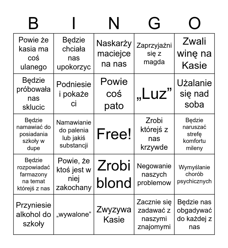 This bingo card has a free space and 24 words: Powie, że ktoś jest w niej zakochany, „wywalone”, Powie coś pato, Przyniesie alkohol do szkoły, Zwali winę na Kasie, Powie że kasia ma coś ulanego, Będzie próbowała nas sklucic, Będzie chciała nas upokorzyc, Zrobi którejś z nas krzywde, Zrobi blond, „Luz”, Będzie namawiać do posiadania szkoły w dupe, Negowanie naszych problemow, Wymyślanie chorób psychicznych, Podniesie i pokaże ci, Zacznie się zadawać z naszymi znajomymi, Będzie naruszać strefę komfortu mileny, Naskarży maciejce na nas, Użalanie się nad soba, Namawianie do palenia lub jakiś substancji, Będzie nas obgadywać do każdej z nas, Będzie rozpowiadać farmazony na temat którejś z nas, Zaprzyjaźni się z magda and Zwyzywa Kasie.
