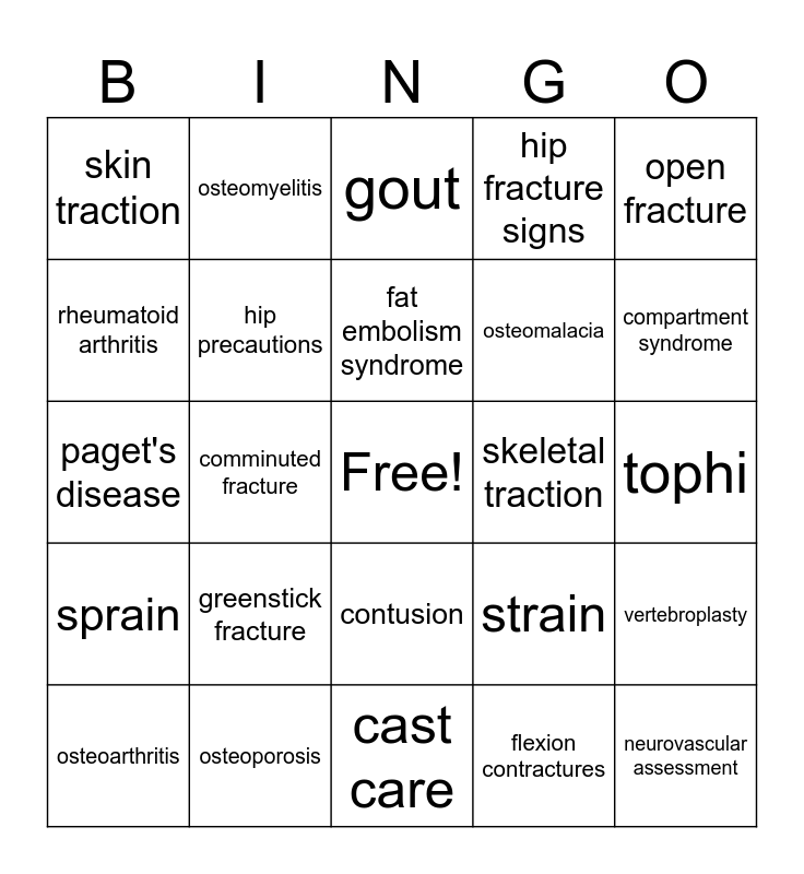 This bingo card has a free space and 24 words: greenstick fracture, osteoporosis, fat embolism syndrome, osteoarthritis, open fracture, skin traction, rheumatoid arthritis, osteomyelitis, skeletal traction, contusion, osteomalacia, paget's disease, strain, vertebroplasty, hip precautions, flexion contractures, tophi, gout, compartment syndrome, comminuted fracture, neurovascular assessment, sprain, hip fracture signs and cast care.