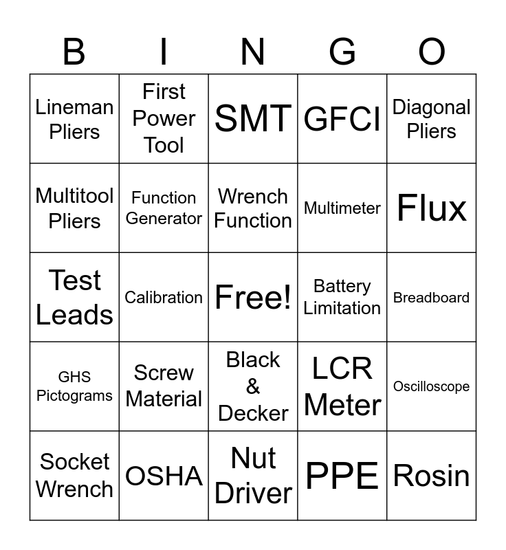 This bingo card has a free space and 25 words: Screw Material, Nut Driver, Wrench Function, Socket Wrench, Diagonal Pliers, Lineman Pliers, Multitool Pliers, First Power Tool, Battery Limitation, Black & Decker, Multimeter, Test Leads, LCR Meter, Oscilloscope, Function Generator, Solder, Breadboard, SMT, Flux, Calibration, Rosin, OSHA, GHS Pictograms, GFCI and PPE.
