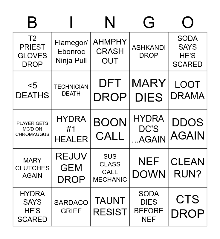 This bingo card has a free space and 24 words: REJUV GEM DROP, SARDACO GRIEF, DFT DROP, HYDRA SAYS HE'S SCARED, SODA SAYS HE'S SCARED, T2 PRIEST GLOVES DROP, <5 DEATHS, Flamegor/ Ebonroc Ninja Pull, HYDRA DC'S ...AGAIN, SUS CLASS CALL MECHANIC, MARY DIES, PLAYER GETS MC'D ON CHROMAGGUS, NEF DOWN, CLEAN RUN?, TECHNICIAN DEATH, SODA DIES BEFORE NEF, DDOS AGAIN, AHMPHY CRASH OUT, LOOT DRAMA, HYDRA #1 HEALER, CTS DROP, MARY CLUTCHES AGAIN, ASHKANDI DROP and TAUNT RESIST.
