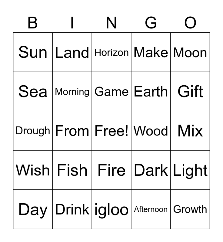 This bingo card has a free space and 24 words: Fish, Drink, Game, Day, Moon, Sun, Sea, Land, Wood, Fire, Earth, Drough, Dark, Light, Morning, Afternoon, Mix, Horizon, Gift, From, Growth, Wish, Make and igloo.