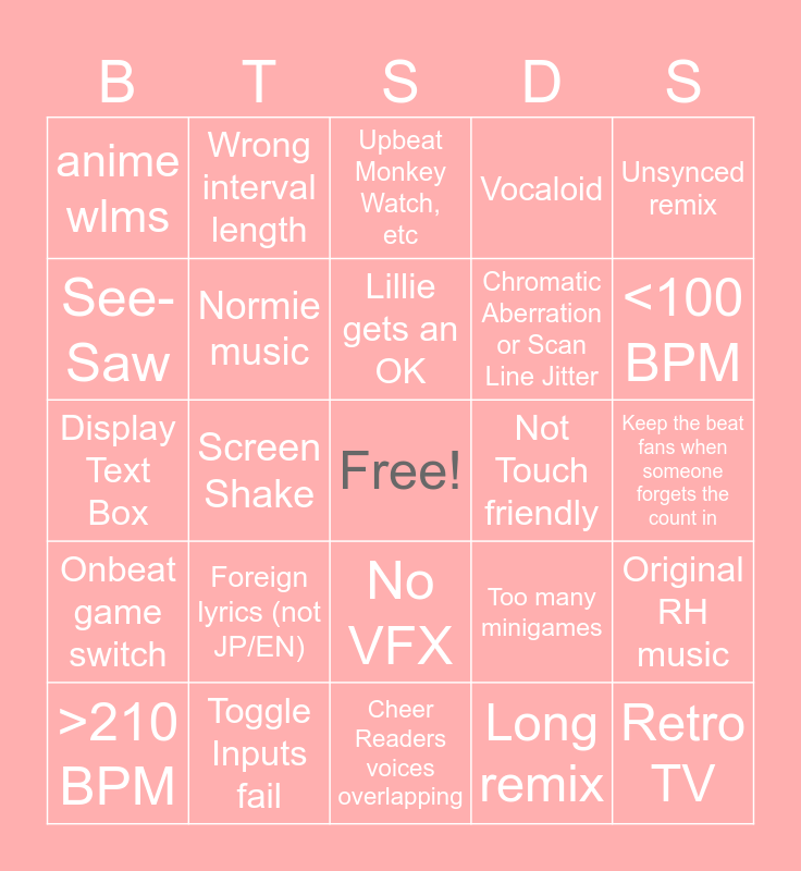 This bingo card has a free space and 39 words: New Remix/Your Name/Artist/Remix Description, Karate Man, Untuned tunable game, Normie music, >210 BPM, No VFX, Lillie gets an OK, Good remix, Unsynced remix, Onbeat game switch, Screen Shake, Vocaloid, Retro TV, Keep the beat fans when someone forgets the count in, Not Touch friendly, Foreign lyrics (not JP/EN), How to Second Contact, anime wlms, Stacked Spaceball, Too many minigames, See-Saw, Cheer Readers voices overlapping, Chromatic Aberration or Scan Line Jitter, <100 BPM, Unfinished, First remix, MP3 audio, Lockstep, Hit 3! outside Karate Man, Wrong interval length, Any custom cue, Eyestrain, Upbeat Monkey Watch, etc, Toggle Inputs fail, Long remix, Short remix, Original RH music, Display Text Box and Joke Remix.