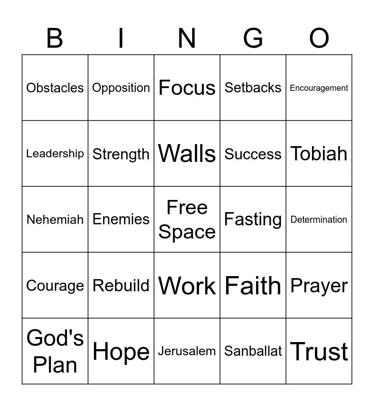 This bingo card has a free space and 24 words: Rebuild, Hope, Walls, God's Plan, Encouragement, Obstacles, Leadership, Opposition, Fasting, Work, Success, Nehemiah, Faith, Prayer, Strength, Sanballat, Determination, Focus, Tobiah, Enemies, Trust, Courage, Setbacks and Jerusalem.
