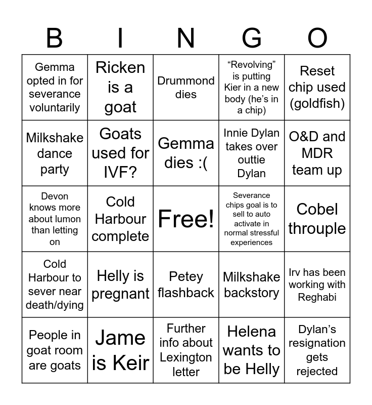 This bingo card has a free space and 24 words: Helly is pregnant, Jame is Keir, Gemma dies :(, People in goat room are goats, Reset chip used (goldfish), Gemma opted in for severance voluntarily, Milkshake dance party, Ricken is a goat, Severance chips goal is to sell to auto activate in normal stressful experiences, Petey flashback, Innie Dylan takes over outtie Dylan, Devon knows more about lumon than letting on, Milkshake backstory, Irv has been working with Reghabi, Goats used for IVF?, Helena wants to be Helly, Cobel throuple, Drummond dies, O&D and MDR team up, Cold Harbour complete, Dylan’s resignation gets rejected, Cold Harbour to sever near death/dying, “Revolving” is putting Kier in a new body (he’s in a chip) and Further info about Lexington letter.