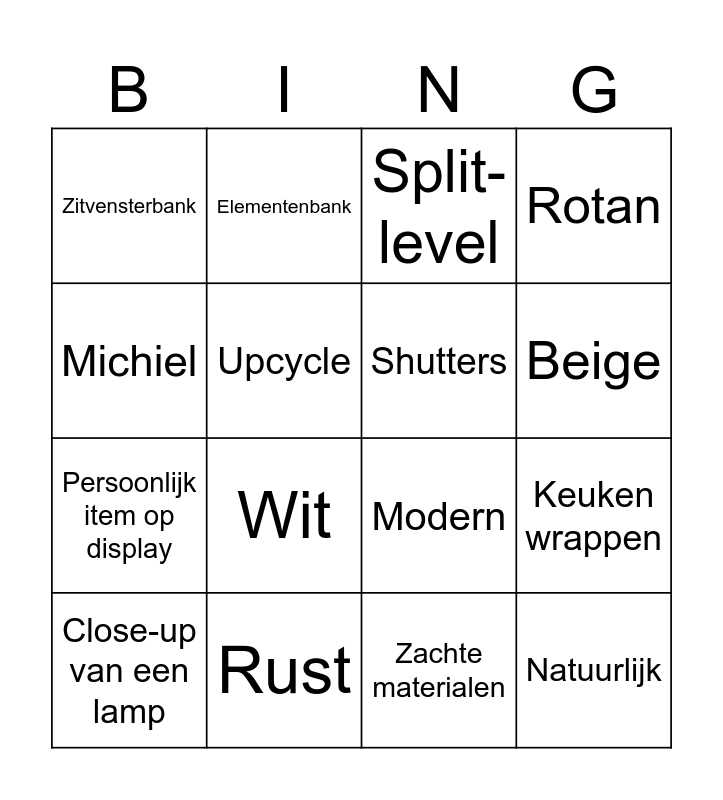 This bingo card has 64 words: Free!, Gewoon Gers, Werk aan de Muur, Robuust, Cees maakt een flauwe grap, Room-divider, Elementenbank, Ton-sur-ton, Beige, Aardse tinten, Pasteltinten, Industrieel, Zachte materialen, Michiel, Organisch, Upcycle, Keuken wrappen, Zitvensterbank, Kinderhoek, Persoonlijk item op display, Visgraat, Natuurlijk, Rotan, Zwart, Hotel Chic, Tegelwand, Upstairs, Bank bij de eettafel, Onlineverf.nl, Stoer, Kast op maat, Vloerverwarming, Grijs, Geen karakter, Wit, Lichte kleuren, Landelijk, Patroonbehang, Antraciet, Shutters, Modern, Rust, Geen lef, Lokale kunstenaar, Kookeiland, Close-up van een lamp, Buiten naar binnen halen, "Het is echt heel anders", Saai, Stylist kiest een kleurenpalet, Aanhuis.nl, Tierelantijntjes, Gadgets, Vitrage met afstandsbediening, Slimme verlichting, Leer, Split-level, Speels, Goud, Vintage, Aaibaar, DIY, Structuurbehang and Ronde vormen.