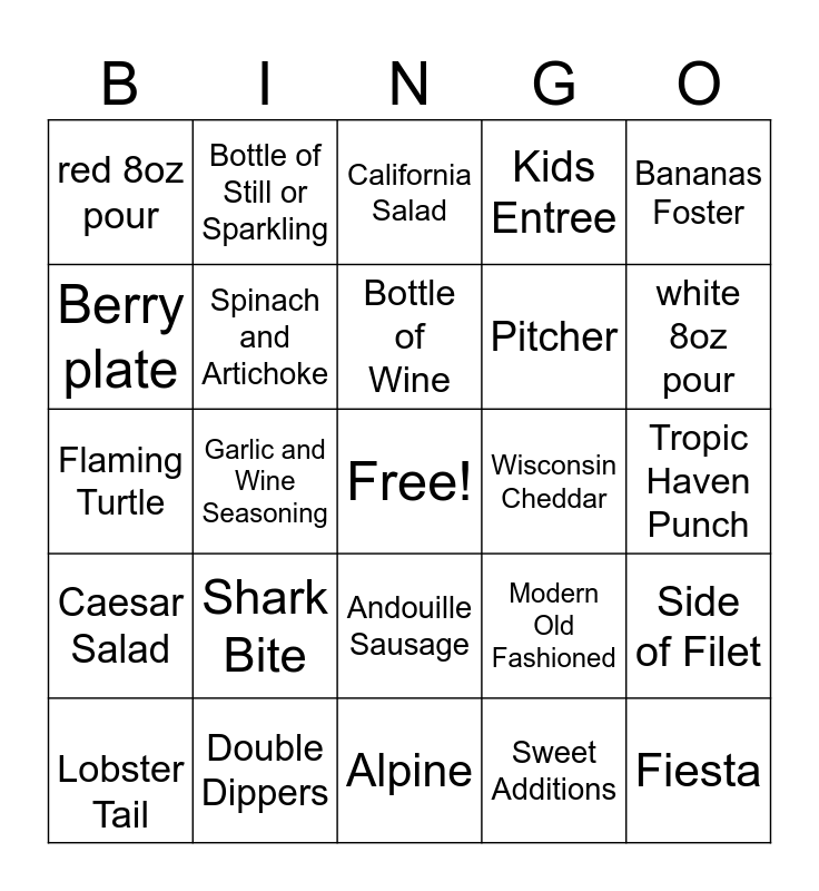 This bingo card has a free space and 24 words: Lobster Tail, Shark Bite, Bottle of Wine, Sweet Additions, Bananas Foster, red 8oz pour, Bottle of Still or Sparkling, California Salad, Wisconsin Cheddar, Tropic Haven Punch, Flaming Turtle, Spinach and Artichoke, Modern Old Fashioned, Side of Filet, Berry plate, Double Dippers, Alpine, Kids Entree, white 8oz pour, Caesar Salad, Garlic and Wine Seasoning, Andouille Sausage, Pitcher and Fiesta.