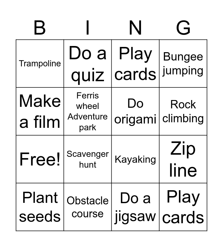 This bingo card has 20 words: Plant seeds, Roller coaster, Play cards, Zip line, Play with friends, Scavenger hunt, Do a jigsaw, Bungee jumping, Free!, Do a quiz, Kayaking, Rock climbing, Trampoline, Obstacle course, Do origami, Play cards, Make a film, Ferris wheel Adventure park, Make cupcakes and Read a magazine.