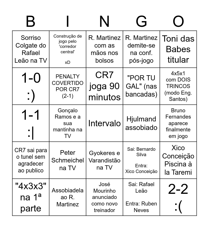 This bingo card has a free space and 24 words: Peter Schmeichel na TV, Assobiadela ao R. Martinez, CR7 joga 90 minutos, "4x3x3" na 1ª parte, Toni das Babes titular, Sorriso Colgate do Rafael Leão na TV, 1-0 :), Construção de jogo pelo 'corredor central' xD, Hjulmand assobiado, Gyokeres e Varandistão na TV, "POR TU GAL" (nas bancadas), 1-1 :|, Sai: Bernardo Silva Entra: Xico Conceição, Xico Conceição Piscina à la Taremi, PENALTY COVERTIDO POR CR7 (2-1), Sai: Rafael Leão Entra: Ruben Neves, Bruno Fernandes aparece finalmente em jogo, R. Martinez com as mãos nos bolsos, 4x5x1 com DOIS TRINCOS (modo Eng. Santos), Gonçalo Ramos e a sua mantinha na TV, 2-2 :(, CR7 sai para o tunel sem agradecer ao publico, R. Martinez demite-se na conf. pós-jogo and José Mourinho anunciado como novo treinador.