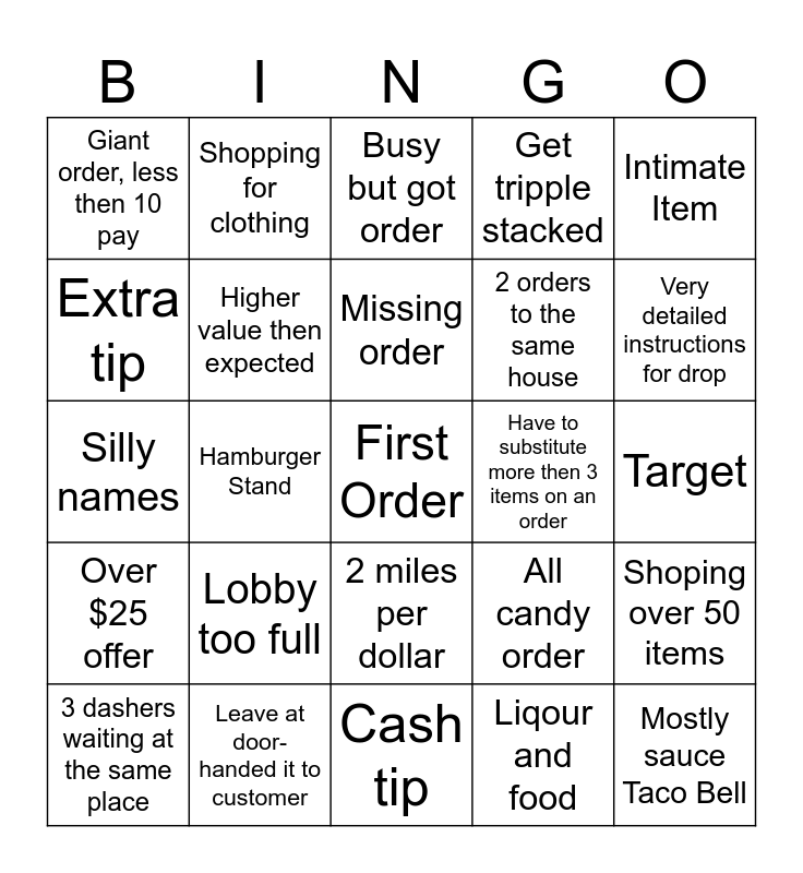This bingo card has a free space and 28 words: Shoping over 50 items, Little Caesars again..., 2 orders to the same house, Liqour and food, Extra tip, Busy but got order, Shopping for clothing, Over $25 offer, Have to substitute more then 3 items on an order, 3 dashers waiting at the same place, Silly names, Get tripple stacked, Leave at door-handed it to customer, Cash tip, Very detailed instructions for drop, Over 10 miles for a drop off, Lobby too full, Higher value then expected, Missing order, 2 miles per dollar, Giant order, less then 10 pay, Got offered to unassign, Mostly sauce Taco Bell, Hamburger Stand, Target, All candy order, Intimate Item and Pet Store.