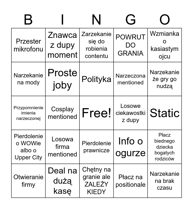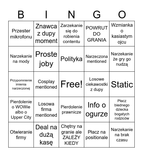 This bingo card has a free space and 24 words: Losowa firma mentioned, Deal na dużą kasę, Polityka, Otwieranie firmy, Wzmianka o kasiastym ojcu, Przester mikrofonu, Narzekanie na mody, Znawca z dupy moment, Losowe ciekawostki z dupy, Pierdolenie prawnicze, Narzeczona mentioned, Przypomnienie imienia narzeczonej, Info o ogurze, Płacz biednego dziecka bogatych rodziców, Proste joby, Płacz na positionale, Static, Zarzekanie się do robienia contentu, Narzekanie że gry go nudzą, Cosplay mentioned, Narzekanie na brak czasu, Pierdolenie o WOWie albo o Upper City, POWRUT DO GRANIA and Chętny na granie ale ZALEŻY KIEDY.