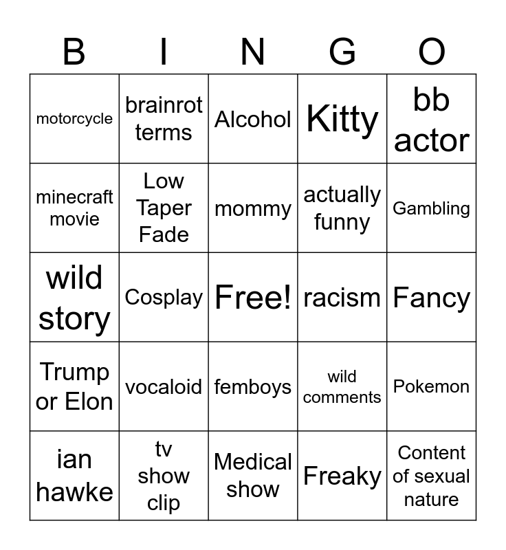This bingo card has a free space and 24 words: vocaloid, tv show clip, mommy, ian hawke, bb actor, motorcycle, minecraft movie, brainrot terms, racism, femboys, actually funny, wild story, wild comments, Pokemon, Low Taper Fade, Freaky, Fancy, Alcohol, Gambling, Cosplay, Content of sexual nature, Trump or Elon, Kitty and Medical show.
