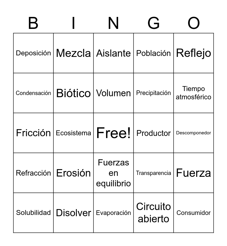 This bingo card has a free space and 39 words: Densidad, Volumen, Abiótico, Biótico, Solubilidad, Fuerzas en equilibrio, Volumen, Organismo, Reflejo, Refracción, Ecosistema, Población, Consumidor, Descomponedor, Productor, Erosión, Meteorización, Deposición, Magnetismo, Transparencia, Condensación, Evaporación, Precipitación, Tiempo atmosférico, Clima, Rotación, Revolución, Soluto, Disolvente, Mezcla, Solución, Conductor, Aislante, Disolver, Circuito abierto, Circuito cerrado, Fuerza, Fricción and Combustibles fósiles.