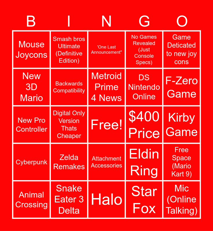 This bingo card has a free space and 25 words: Zelda Remakes, Halo, Metroid Prime 4 News, Animal Crossing, Game Deticated to new joy cons, Mouse Joycons, New 3D Mario, Smash bros Ultimate (Definitive Edition), $400 Price, Attachment Accessories, DS Nintendo Online, New Pro Controller, Eldin Ring, Free Space (Mario Kart 9), Backwards Compatibility, Mii Focused Multi-player Game, Kirby Game, 'One Last Announcement", F-Zero Game, Digital Only Version Thats Cheaper, Mic (Online Talking), Snake Eater 3 Delta, Cyberpunk, No Games Revealed (Just Console Specs) and Star Fox.