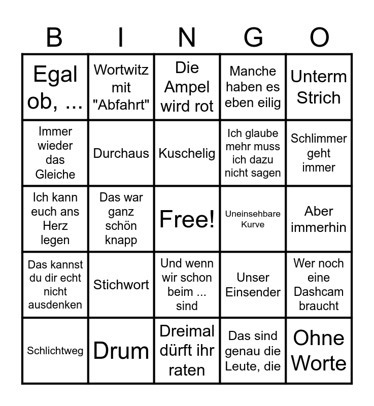 This bingo card has a free space and 24 words: Stichwort, Drum, Kuschelig, Schlichtweg, Unterm Strich, Egal ob, ..., Immer wieder das Gleiche, Wortwitz mit "Abfahrt", Uneinsehbare Kurve, Und wenn wir schon beim ... sind, Ich glaube mehr muss ich dazu nicht sagen, Ich kann euch ans Herz legen, Unser Einsender, Wer noch eine Dashcam braucht, Durchaus, Das sind genau die Leute, die, Aber immerhin, Die Ampel wird rot, Schlimmer geht immer, Das war ganz schön knapp, Ohne Worte, Das kannst du dir echt nicht ausdenken, Manche haben es eben eilig and Dreimal dürft ihr raten.