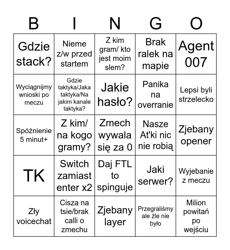 This bingo card has a free space and 24 words: Switch zamiast enter x2, Cisza na tsie/brak calli o zmechu, Jakie hasło?, Zły voicechat, Agent 007, Gdzie stack?, Wyciągnijmy wnioski po meczu, Nieme z/w przed startem, Nasze At'ki nic nie robią, Daj FTL to spinguje, Panika na overranie, Spóźnienie 5 minut+, Jaki serwer?, Wyjebanie z meczu, Gdzie taktyka/Jaka taktyka/Na jakim kanale taktyka?, Przegraliśmy ale źle nie było, Zjebany opener, Z kim gram/ kto jest moim slem?, Lepsi byli strzelecko, Z kim/ na kogo gramy?, Milion powitań po wejściu, TK, Brak ralek na mapie and Zjebany layer.