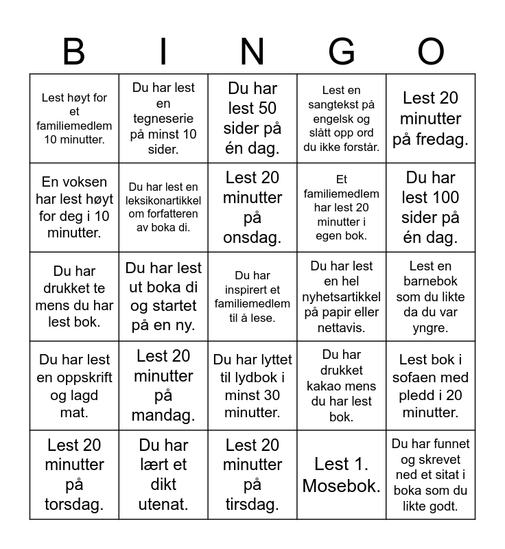 This bingo card has 25 words: Lest 20 minutter på mandag., Lest 20 minutter på tirsdag., Lest 20 minutter på onsdag., Lest 20 minutter på torsdag., Lest 20 minutter på fredag., Lest høyt for et familiemedlem 10 minutter., En voksen har lest høyt for deg i 10 minutter., Du har lest en tegneserie på minst 10 sider., Du har lest en hel nyhetsartikkel på papir eller nettavis., Du har lyttet til lydbok i minst 30 minutter., Et familiemedlem har lest 20 minutter i egen bok., Du har drukket te mens du har lest bok., Du har drukket kakao mens du har lest bok., Lest bok i sofaen med pledd i 20 minutter., Du har lest en leksikonartikkel om forfatteren av boka di., Du har funnet og skrevet ned et sitat i boka som du likte godt., Lest en barnebok som du likte da du var yngre., Du har lest 50 sider på én dag., Du har lest 100 sider på én dag., Du har lest ut boka di og startet på en ny., Du har inspirert et familiemedlem til å lese., Du har lært et dikt utenat., Du har lest en oppskrift og lagd mat., Lest en sangtekst på engelsk og slått opp ord du ikke forstår. and Lest 1. Mosebok..