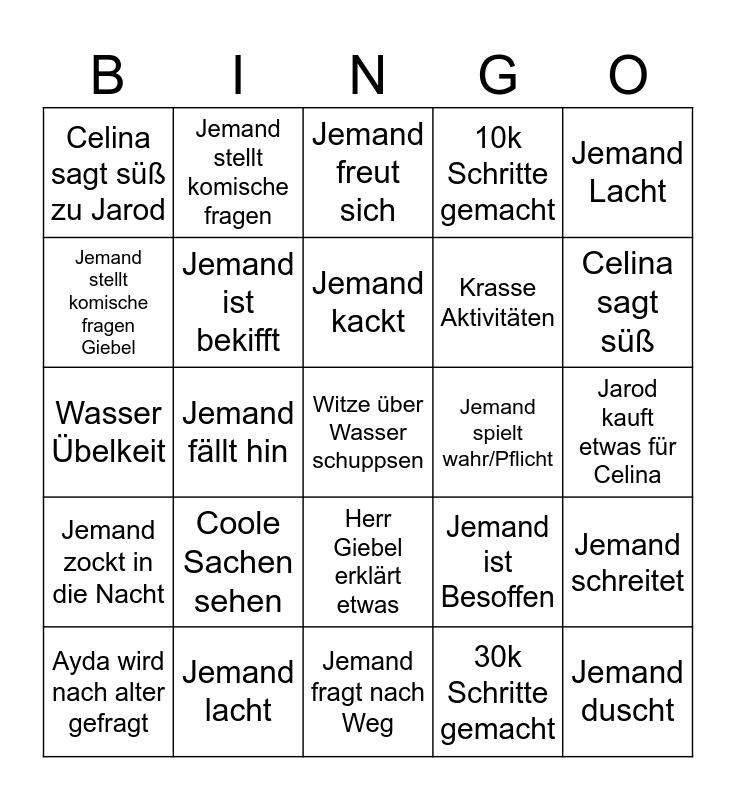 This bingo card has a free space and 24 words: Coole Sachen sehen, Jemand lacht, Jemand kackt, Ayda wird nach alter gefragt, Jemand Lacht, Celina sagt süß zu Jarod, Jemand stellt komische fragen Giebel, Jemand stellt komische fragen, Jemand spielt wahr/Pflicht, Herr Giebel erklärt etwas, Krasse Aktivitäten, Wasser Übelkeit, Jemand ist Besoffen, Jemand schreitet, Jemand ist bekifft, 30k Schritte gemacht, Jarod kauft etwas für Celina, Jemand freut sich, Celina sagt süß, Jemand fällt hin, Jemand duscht, Jemand zockt in die Nacht, 10k Schritte gemacht and Jemand fragt nach Weg.